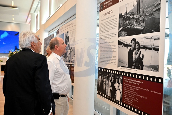 Le prince Albert II de Monaco a fait un passage au Yacht Club de Monaco dans le cadre de la Monaco Classic Week, en compagne de la navigatrice Catherine Chabaud et guidé par Bernard d'Alessandri, le secrétaire et directeur général du Yacht Club de Monaco, le 11 septembre 2025. Ils ont déambulaient sur le quai où les navires d'époques, à voiles et à moteurs sont amarrés. Ils ont ensuite découvert une exposition photographique sur les bateaux et le cinéma avec un clin d'oeil à la princesse Grace et une ilage sortie d'une comédie musicale hollywodienne de 1956, High Society. © Bruno Bebert / Bestimage Prince Albert II of Monaco visited the Monaco Yacht Club as part of Monaco Classic Week, accompanied by sailor Catherine Chabaud and guided by Bernard d'Alessandri, secretary and general manager of the Monaco Yacht Club, on September 11, 2025. They strolled along the quay where vintage sailing and motor boats are moored. They then discovered a photographic exhibition on boats and cinema with a nod to Princess Grace and a scene from the 1956 Hollywood musical High Society.