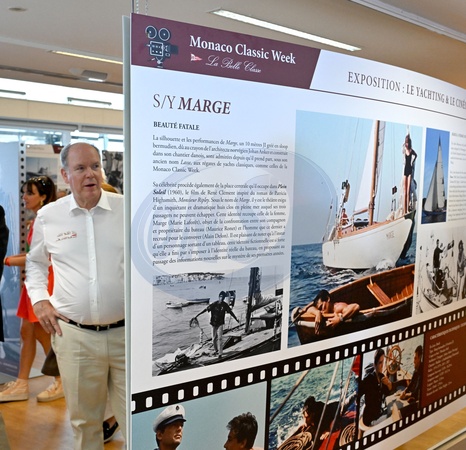 Le prince Albert II de Monaco a fait un passage au Yacht Club de Monaco dans le cadre de la Monaco Classic Week, en compagne de la navigatrice Catherine Chabaud et guidé par Bernard d'Alessandri, le secrétaire et directeur général du Yacht Club de Monaco, le 11 septembre 2025. Ils ont déambulaient sur le quai où les navires d'époques, à voiles et à moteurs sont amarrés. Ils ont ensuite découvert une exposition photographique sur les bateaux et le cinéma avec un clin d'oeil à la princesse Grace et une ilage sortie d'une comédie musicale hollywodienne de 1956, High Society. © Bruno Bebert / Bestimage Prince Albert II of Monaco visited the Monaco Yacht Club as part of Monaco Classic Week, accompanied by sailor Catherine Chabaud and guided by Bernard d'Alessandri, secretary and general manager of the Monaco Yacht Club, on September 11, 2025. They strolled along the quay where vintage sailing and motor boats are moored. They then discovered a photographic exhibition on boats and cinema with a nod to Princess Grace and a scene from the 1956 Hollywood musical High Society.