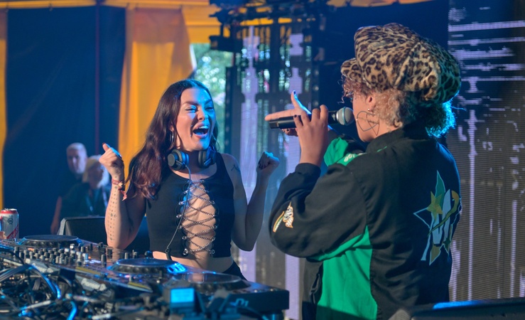 Eva Lazarus and DJ Hazel Marimba at Mucky Weekender 2025 -Thursday, Vicarage Farm, Woodman Cott, Winchester, Credit:Jules Annan / Avalon
