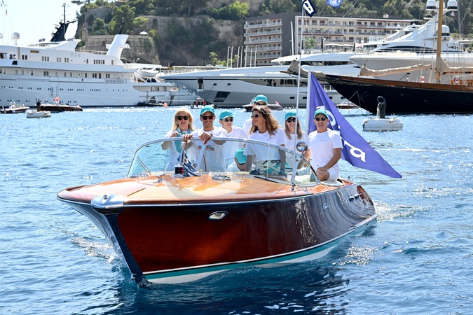 La famille Riva sur le Lipicar IV, l’Aquarama personnel de Carlo Riva, baptisé d’après ses trois filles, Lia, Pia et Carla, durant la XVIIe Monaco Classic Week à Monaco organisée par le Yacht Club de Monaco