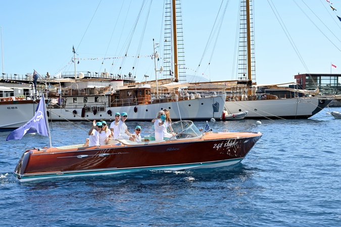 La famille Riva sur le Lipicar IV, l’Aquarama personnel de Carlo Riva, baptisé d’après ses trois filles, Lia, Pia et Carla, durant la XVIIe Monaco Classic Week à Monaco organisée par le Yacht Club de Monaco