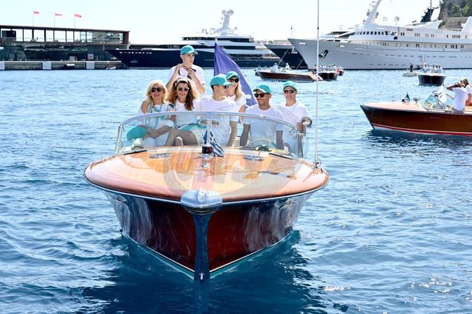 La famille Riva sur le Lipicar IV, l’Aquarama personnel de Carlo Riva, baptisé d’après ses trois filles, Lia, Pia et Carla, durant la XVIIe Monaco Classic Week à Monaco organisée par le Yacht Club de Monaco