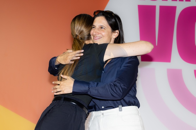 Democratic Party Unity Day. In the photo Elly Schlein, secretary of the Democratic Party hugs Jacinda Ardern, former Prime Minister of New Zealand . Milan, Italy 12 September 2025, Credit:Rossella Papetti / Avalon