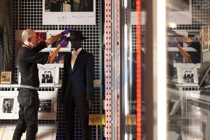 A V&A Technician adjusts the suit Bowie wore for the 1975 Grammy Awards, made by Jan Girard. On Saturday 13 September, V&A East Storehouse opens its doors to the world-first David Bowie Centre on East Bank in Queen Elizabeth Olympic Park, designed by design company, IDK. A new permanent home for David Bowie's archive – made available to the public in entirety for the first time – the Centre is first and foremost a working archive and collections store with reading areas and a study room., Credit:David Parry / Avalon