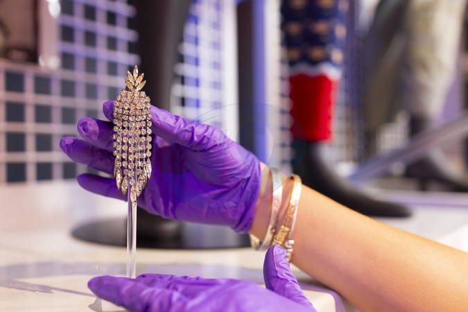A V&A Technician installs a diamante earring worn by David Bowie as Ziggy Stardust in 1972. On Saturday 13 September, V&A East Storehouse opens its doors to the world-first David Bowie Centre on East Bank in Queen Elizabeth Olympic Park, designed by design company, IDK. A new permanent home for David Bowie's archive – made available to the public in entirety for the first time – the Centre is first and foremost a working archive and collections store with reading areas and a study room., Credit:David Parry / Avalon