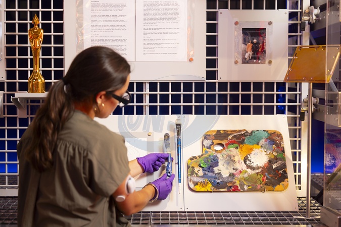 A V&A Technician installs David Bowie's paint palette and knife. On Saturday 13 September, V&A East Storehouse opens its doors to the world-first David Bowie Centre on East Bank in Queen Elizabeth Olympic Park, designed by design company, IDK. A new permanent home for David Bowie's archive – made available to the public in entirety for the first time – the Centre is first and foremost a working archive and collections store with reading areas and a study room., Credit:David Parry / Avalon