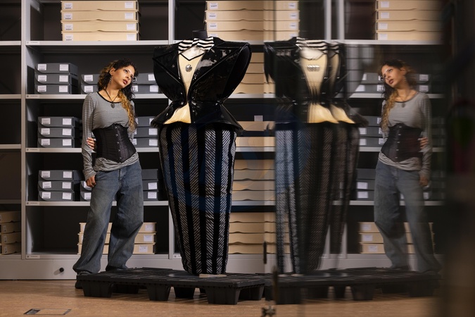 A visitor looks at the Aladdin Sane jacket designed by Freddie Burretti for David Bowie on the Ziggy Stardust live tour in 1973 On Saturday 13 September, V&A East Storehouse opens its doors to the world-first David Bowie Centre on East Bank in Queen Elizabeth Olympic Park, designed by design company, IDK. A new permanent home for David Bowie's archive – made available to the public in entirety for the first time – the Centre is first and foremost a working archive and collections store with reading areas and a study room., Credit:David Parry / Avalon
