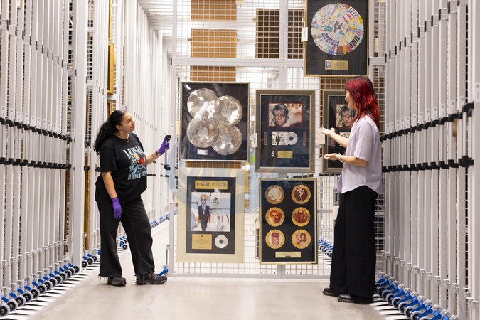 A visitor sees some of David Bowie's awards in storage, at their Order an Object appointment. On Saturday 13 September, V&A East Storehouse opens its doors to the world-first David Bowie Centre on East Bank in Queen Elizabeth Olympic Park, designed by design company, IDK. A new permanent home for David Bowie's archive – made available to the public in entirety for the first time – the Centre is first and foremost a working archive and collections store with reading areas and a study room., Credit:David Parry / Avalon