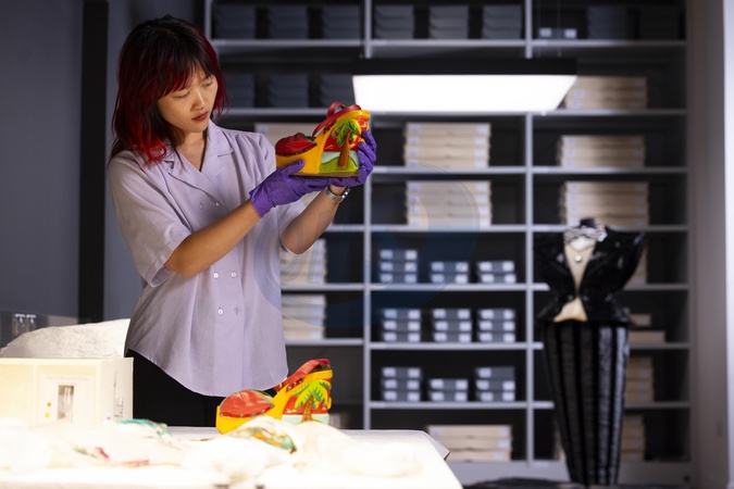 A visitor picks up shoes designed by Pelican Footwear for David Bowie as Ziggy Stardust in 1972. On Saturday 13 September, V&A East Storehouse opens its doors to the world-first David Bowie Centre on East Bank in Queen Elizabeth Olympic Park, designed by design company, IDK. A new permanent home for David Bowie's archive – made available to the public in entirety for the first time – the Centre is first and foremost a working archive and collections store with reading areas and a study room., Credit:David Parry / Avalon