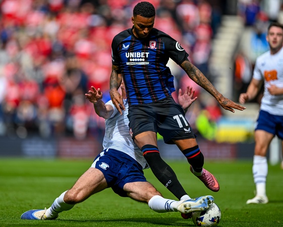 /11/ is tackled close to the PNE box during the Sky Bet Championship match Preston North End vs Middlesbrough at Deepdale, Preston, United Kingdom, 13th September 2025, Credit:Adam Gee/News Images / Avalon