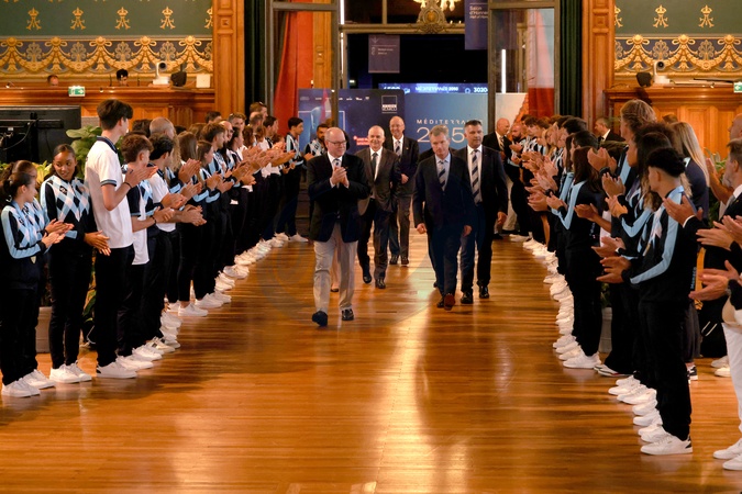 No Tabloïds - Le prince Albert II de Monaco, Yvette Lambin-Berti lors de la réception des athlètes des jeux des petits états d'Europe au musée océanographique à Monaco le 11 septembre 2025. © Claudia Albuquerque / Bestimage NO TABLOIDS Reception for athletes participating in the Games of the Small States of Europe at the Oceanographic Museum in Monaco on September 11, 2025.