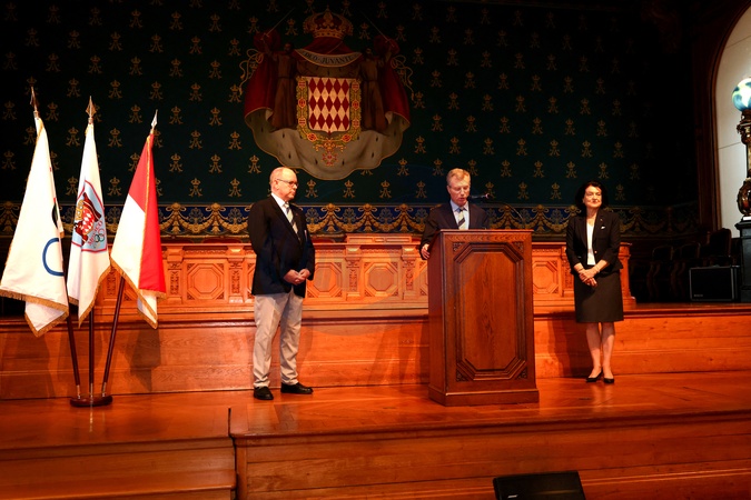 No Tabloïds - Le prince Albert II de Monaco, Christophe Mirmand, Yvette Lambin-Berti lors de la réception des athlètes des jeux des petits états d'Europe au musée océanographique à Monaco le 11 septembre 2025. © Claudia Albuquerque / Bestimage NO TABLOIDS Reception for athletes participating in the Games of the Small States of Europe at the Oceanographic Museum in Monaco on September 11, 2025.