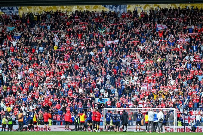Supporters of Middlesbrough with their players during the Sky Bet Championship match Preston North End vs Middlesbrough at Deepdale, Preston, United Kingdom, 13th September 2025, Credit:Adam Gee/News Images / Avalon