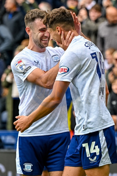 Robbie Brady of Preston North End celebrates with the goal scorer Jordan Story of Preston North End during the Sky Bet Championship match Preston North End vs Middlesbrough at Deepdale, Preston, United Kingdom, 13th September 2025, Credit:Adam Gee/News Images / Avalon