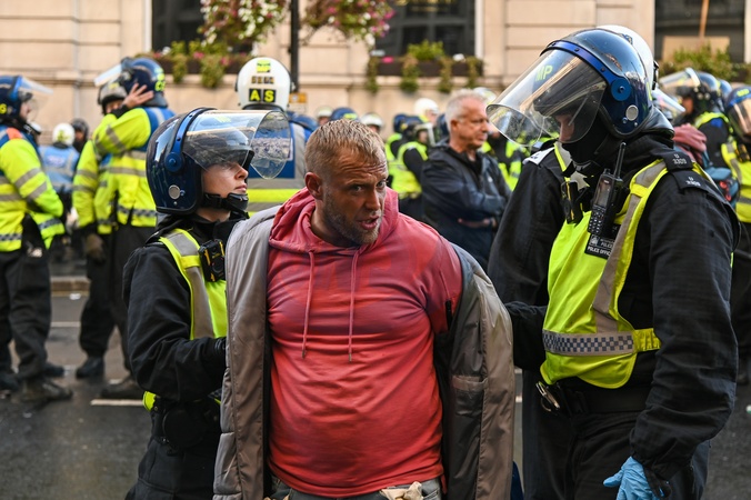 Zwolennicy Tommy'ego Robinsona gromadzą się na Trafalgar Square 13 września 2025 roku w Londynie w Anglii. Aktywista skrajnej prawicy Tommy Robinson (znany również jako Stephen Yaxley-Lennon) zaprosił swoich zwolenników na wiec w centrum Londynu pod hasłem
