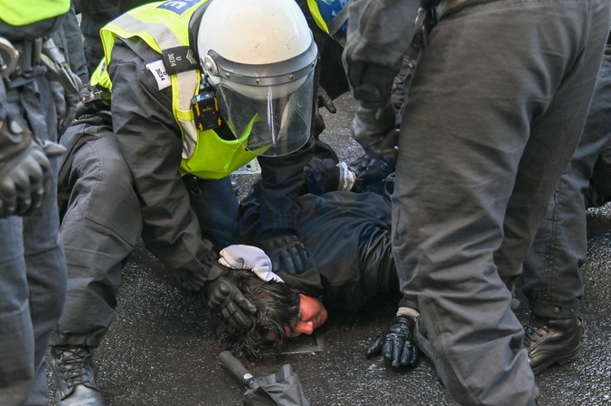 Zwolennicy Tommy'ego Robinsona gromadzą się na Trafalgar Square 13 września 2025 roku w Londynie w Anglii. Aktywista skrajnej prawicy Tommy Robinson (znany również jako Stephen Yaxley-Lennon) zaprosił swoich zwolenników na wiec w centrum Londynu pod hasłem