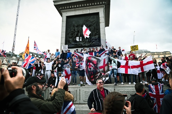 Supporters of Tommy Robinson assemble in Trafalgar Square on September 13, 2025 in London, England. Far-right activist Tommy Robinson (also known as Stephen Yaxley-Lennon) has invited supporters to hold a rally in central London entitled "Unite The Kingdom"., Credit:RBP Red / Avalon