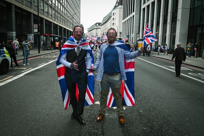 Zwolennicy Tommy'ego Robinsona gromadzą się na Trafalgar Square 13 września 2025 roku w Londynie w Anglii. Aktywista skrajnej prawicy Tommy Robinson (znany również jako Stephen Yaxley-Lennon) zaprosił swoich zwolenników na wiec w centrum Londynu pod hasłem