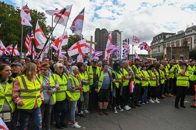 Supporters of Tommy Robinson assemble in Trafalgar Square on September 13, 2025 in London, England. Far-right activist Tommy Robinson (also known as Stephen Yaxley-Lennon) has invited supporters to hold a rally in central London entitled "Unite The Kingdom"., Credit:RBP Red / Avalon