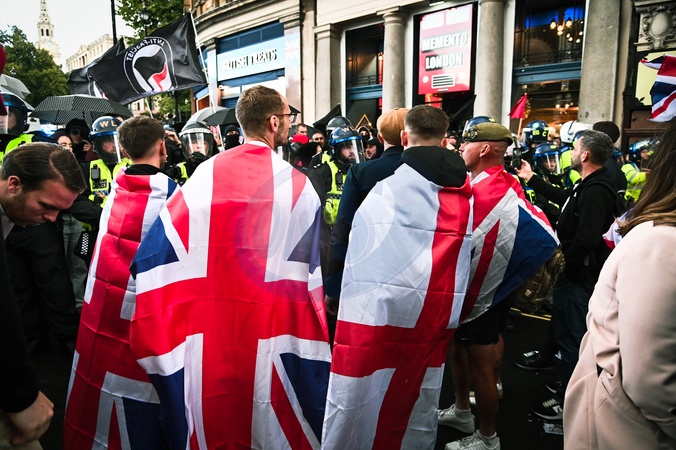 Supporters of Tommy Robinson assemble in Trafalgar Square on September 13, 2025 in London, England. Far-right activist Tommy Robinson (also known as Stephen Yaxley-Lennon) has invited supporters to hold a rally in central London entitled "Unite The Kingdom"., Credit:RBP Red / Avalon
