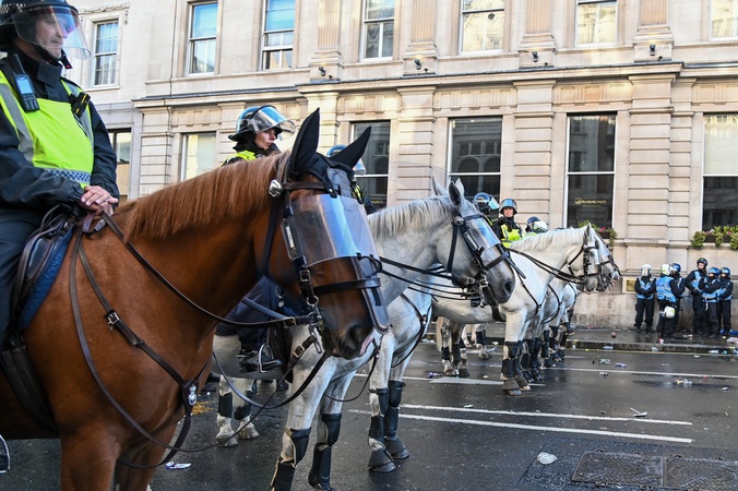 Zwolennicy Tommy'ego Robinsona gromadzą się na Trafalgar Square 13 września 2025 roku w Londynie w Anglii. Aktywista skrajnej prawicy Tommy Robinson (znany również jako Stephen Yaxley-Lennon) zaprosił swoich zwolenników na wiec w centrum Londynu pod hasłem