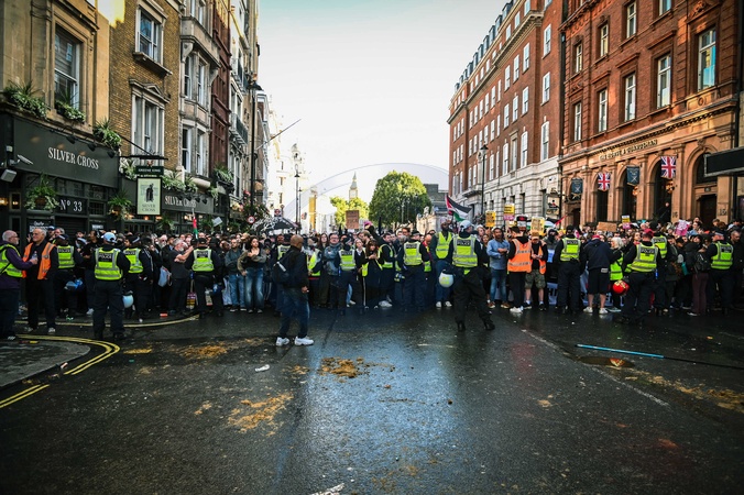Zwolennicy Tommy'ego Robinsona gromadzą się na Trafalgar Square 13 września 2025 roku w Londynie w Anglii. Aktywista skrajnej prawicy Tommy Robinson (znany również jako Stephen Yaxley-Lennon) zaprosił swoich zwolenników na wiec w centrum Londynu pod hasłem