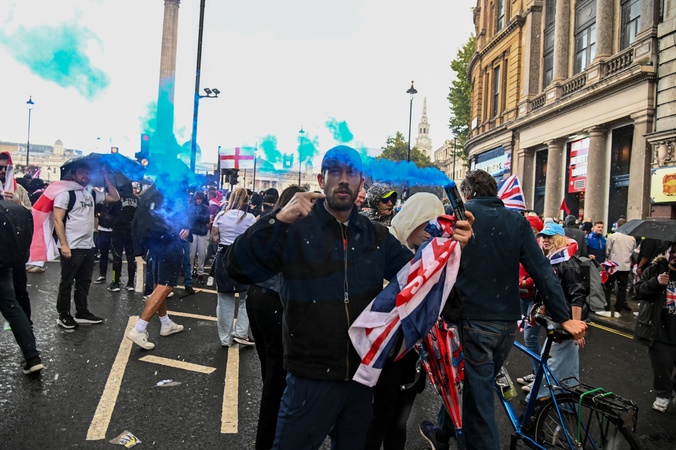 Supporters of Tommy Robinson assemble in Trafalgar Square on September 13, 2025 in London, England. Far-right activist Tommy Robinson (also known as Stephen Yaxley-Lennon) has invited supporters to hold a rally in central London entitled "Unite The Kingd