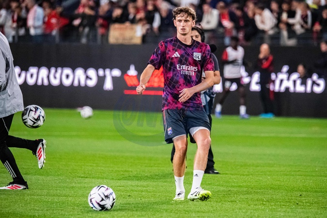Echauffement des joueurs de l'OL - Match de Ligue 1 McDonald's "Rennes - Lyon (3-1)" au Roazhon Park, le 14 septembre 2025. McDonald's Ligue 1 match "Rennes - Lyon (3-1)" at Roazhon Park, September 14, 2025.