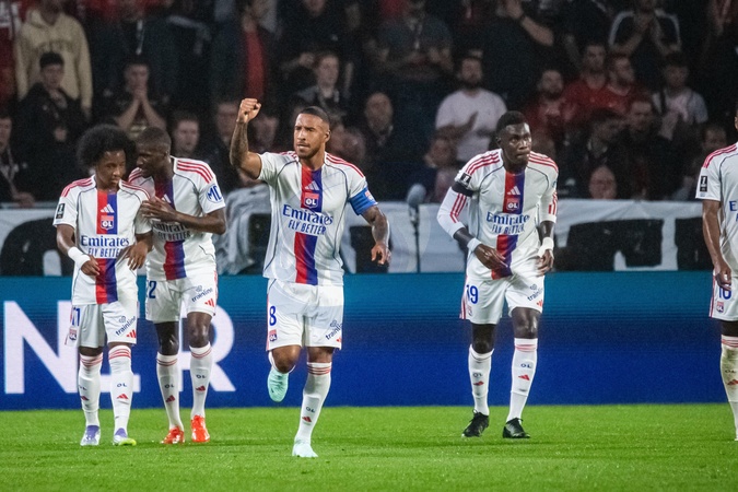 Joie des joueurs de l'OL aprés le but de Corentin Tolisso (OL). - Match de Ligue 1 McDonald's "Rennes - Lyon (3-1)" au Roazhon Park, le 14 septembre 2025. McDonald's Ligue 1 match "Rennes - Lyon (3-1)" at Roazhon Park, September 14, 2025.