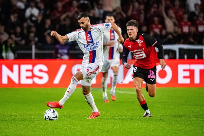 Rachid Ghezzal (OL) Quentin Merlin (Stade Rennais) - Match de Ligue 1 McDonald's "Rennes - Lyon (3-1)" au Roazhon Park, le 14 septembre 2025. McDonald's Ligue 1 match "Rennes - Lyon (3-1)" at Roazhon Park, September 14, 2025.