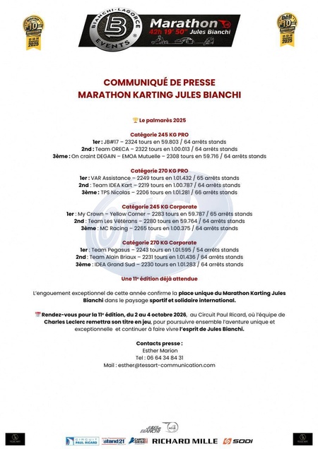 Exclusif - Communiqué de presse lors de la 10ème édition du Marathon Karting Jules Bianchi sur le circuit Paul Ricard en soutien à l'Association Jules Bianchi le 14 septembre 2025. Organisé par Philippe Bianchi et Franck Lagorce de Bianchi Lagorce Events, en soutien à l'Association Jules Bianchi, ce marathon d'endurance de 42h19min50s continue de rassembler pilotes professionnels, célébrités et passionnés autour d'une cause qui dépasse le sport : perpétuer l'esprit et la générosité de Jules. Un chèque sera remis à l'hôpital L'Archet de Nice, à l'issue de la course. --- Pour infos voir vendeur --- © Anne-Sophie Guebey / Bestimage Exclusive - No web en Suisse / Belgique 10th edition of the Jules Bianchi Karting Marathon at the Paul Ricard circuit in support of the Jules Bianchi Association on 14 September 2025.