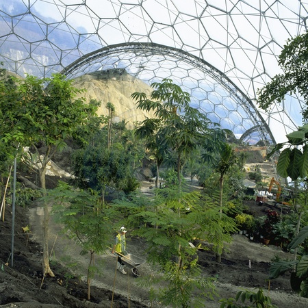 "Landscaping works inside biome at the Eden Project, Cornwall, United Kingdom."
