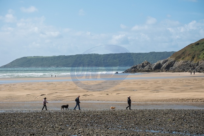 Walkers on beach at Three cliffs bay, Gower peninsular. Wales, UK.