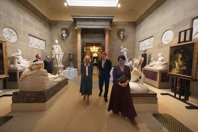 Queen Camilla walks with Lord Burlington (centre), and Queen's Reading Room CEO Vicki Perrin, during a visit to The Queen's Reading Room Festival at Chatsworth House in Bakewell, Derbyshire. Picture date: Friday September 19, 2025. PA Photo. The Queen's Reading Room, launched by Queen Camilla in 2023, is a charity celebrating and promoting the transformative power of books in the UK and beyond, and was born from an Instagram book club launched in lockdown in 2021., Credit:Danny Lawson / Avalon