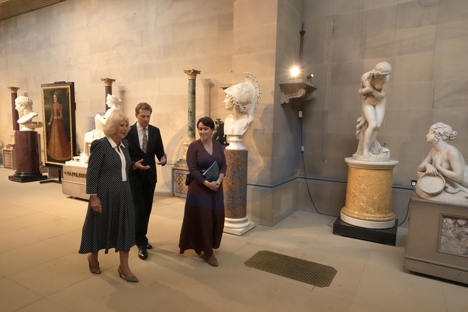 Queen Camilla walks with Lord Burlington (centre), and Queen's Reading Room CEO Vicki Perrin, during a visit to The Queen's Reading Room Festival at Chatsworth House in Bakewell, Derbyshire. Picture date: Friday September 19, 2025. PA Photo. The Queen's Reading Room, launched by Queen Camilla in 2023, is a charity celebrating and promoting the transformative power of books in the UK and beyond, and was born from an Instagram book club launched in lockdown in 2021., Credit:Danny Lawson / Avalon