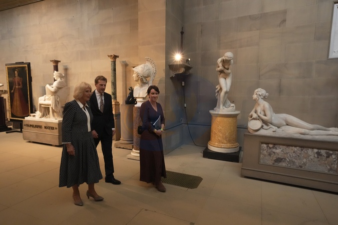 Queen Camilla walks with Lord Burlington (centre), and Queen's Reading Room CEO Vicki Perrin, during a visit to The Queen's Reading Room Festival at Chatsworth House in Bakewell, Derbyshire. Picture date: Friday September 19, 2025. PA Photo. The Queen's Reading Room, launched by Queen Camilla in 2023, is a charity celebrating and promoting the transformative power of books in the UK and beyond, and was born from an Instagram book club launched in lockdown in 2021., Credit:Danny Lawson / Avalon