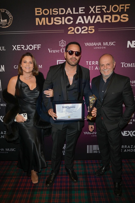Founder of Xerjoff Sergio Momo, Boy Wonder real name Manuel Alejandro Ruiz and his wife Joy Enriquez at Boisdale Music Awards 2025, Boisdale Restaurant, Canary Wharf. London, Credit:Jules Annan / Avalon