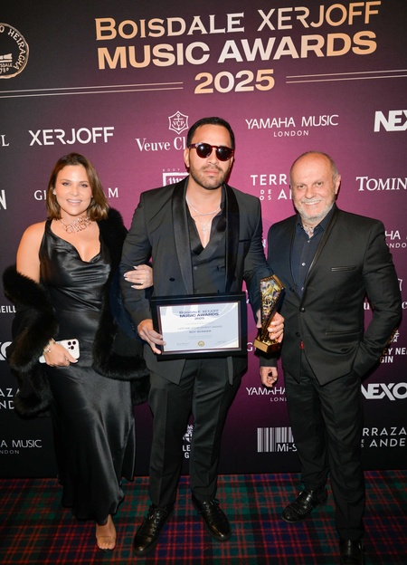 Founder of Xerjoff Sergio Momo, Boy Wonder real name Manuel Alejandro Ruiz and his wife Joy Enriquez at Boisdale Music Awards 2025, Boisdale Restaurant, Canary Wharf. London, Credit:Jules Annan / Avalon