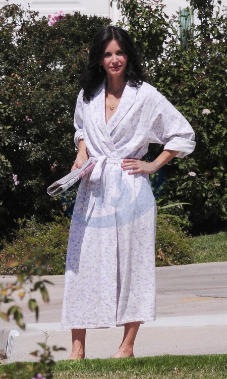 Courtney Cox Arquette w szlafroku na planie serialu "Cougar Town", Los Angeles
