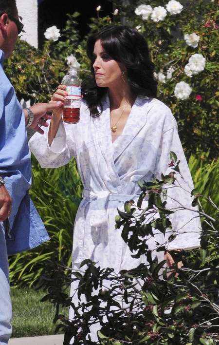 Courtney Cox Arquette w szlafroku na planie serialu "Cougar Town", Los Angeles
