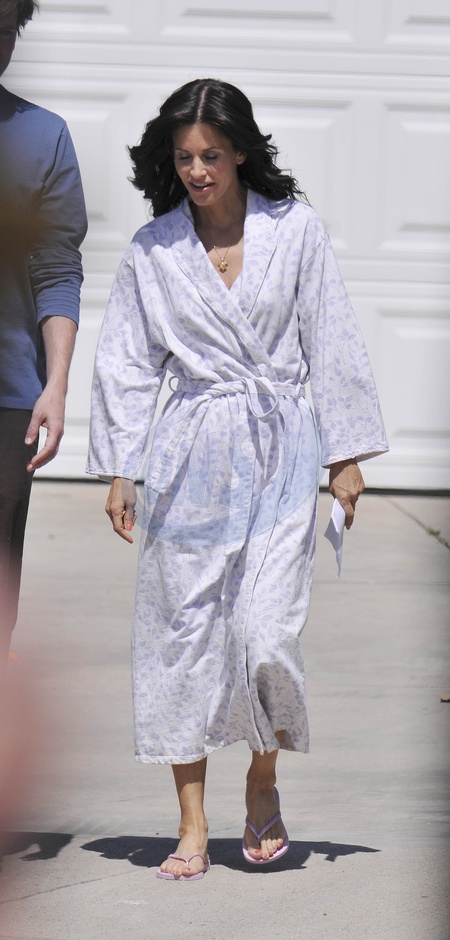Courtney Cox Arquette w szlafroku na planie serialu "Cougar Town", Los Angeles
