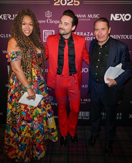 Jools Holland, Ollie Wride and Rebecca Ferguson at Boisdale Music Awards 2025, Boisdale Restaurant, Canary Wharf. London, Credit:Jules Annan / Avalon