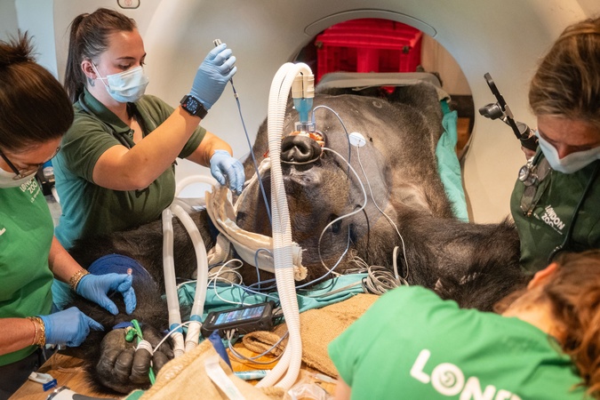 Silverback gorilla Kiburi, the 21-year-old patriarch of London Zoo's western lowland gorilla troop, was given an initial clean bill of health this week – following a mighty trip to the vets for a full health check. The 177kg primate had been under observation after contending with recurrent gastrointestinal issues, leading the Zoo's expert veterinary team to decide that they needed to take a closer look at him, with the help of a CT scan and both veterinary and human health specialists. Before his full health check could take place, Kiburi had to be anaesthetised – which was done with an injection in his upper arm. This seemingly simple procedure took months of planning to achieve, with Kiburi taking part in frequent training with zookeepers and veterinary nurses, so that he would offer his arm for the anaesthetic to be administered. Once anaesthetised, Kiburi was first given a full cardiology examination in the back dens of his Gorilla Kingdom habitat with London Zoo's vets supported by cardiologists from the Royal Veterinary College. Monitoring heart health for any animal is important, and provides the opportunity to assess their overall wellbeing. Once this was completed, it was time to get Kiburi to the CT truck. It took six people to heave the ape onto a gurney, before he had to be driven on a five-minute journey through the zoo on a flatbed truck to the CT scanner, surrounded by vets and nurses monitoring him the whole way. The CT scanner – a huge piece of machinery – had to be hired in, with Burgess Diagnostics Mobile CT Service wheeling their 44-feet long truck into the Zoo's grounds, ready for Kiburi's check-up. The scan, which was focussed on Kiburi's abdomen, revealed no obvious cause for concern, a diagnosis supported by doctors from the NHS who specialise in gastrointestinal health and imaging, and provided unique assistance for Kiburi's procedure., Credit:ZSL London Zoo / Avalon