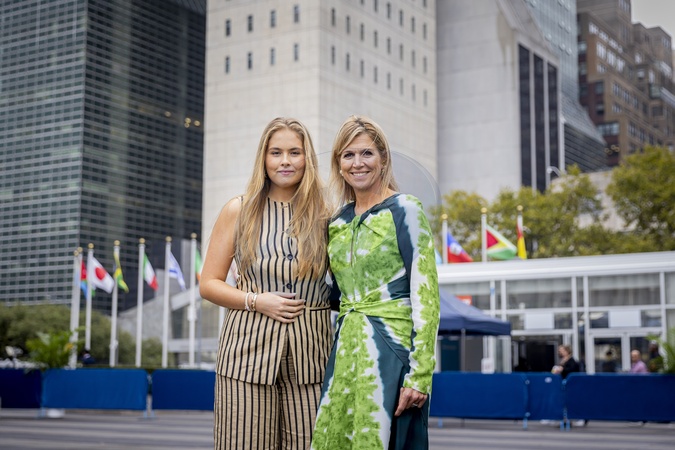 New York, The Netherlands, 2025-09-25 21:08:10NEW YORK, September 25, 2025. Queen Máxima will visit Washington, DC, on Monday, September 22, as the United Nations Secretary-General's Special Advocate for Financial Security (UNSGSA). Princess Amalia will be present throughout the visit to observe Queen Máxima's UN work. PHOTO: NLBeeld. Pictured: Queen Máxima and Princess Amalia pose at the United Nations building in New York., Credit:Avalon