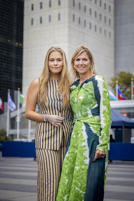 New York, The Netherlands, 2025-09-25 21:08:04NEW YORK, September 25, 2025. Queen Máxima will visit Washington, DC, on Monday, September 22, as the United Nations Secretary-General's Special Advocate for Financial Security (UNSGSA). Princess Amalia will be present throughout the visit to observe Queen Máxima's UN work. PHOTO: NLBeeld. Pictured: Queen Máxima and Princess Amalia pose at the United Nations building in New York., Credit:Avalon
