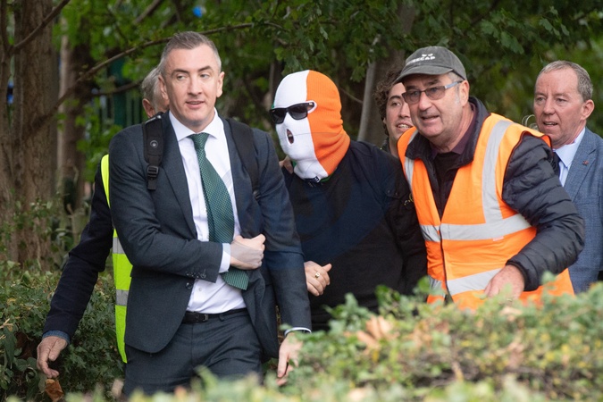 Mo Chara (Liam Óg Ó hAnnaidh) of Northern Irish trio Kneecap (identified by the ring on his right finger) arrives at Woolwich Crown Court in London, England, UK on Friday 26 September, 2025., Credit:Justin Ng / Avalon