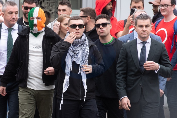 (L-R) - DJ Próvai ( J. J. Ó Dochartaigh), Móglaí Bap (Naoise Ó Cairealláin), and Mo Chara (Liam Óg Ó hAnnaidh) of Northern Irish trio Kneecap depart Woolwich Crown Court in London, England, UK on Friday 26 September, 2025 after judges dismissed a Terrorism charge against Mo Chara (Liam Óg Ó hAnnaidh)., Credit:Justin Ng / Avalon