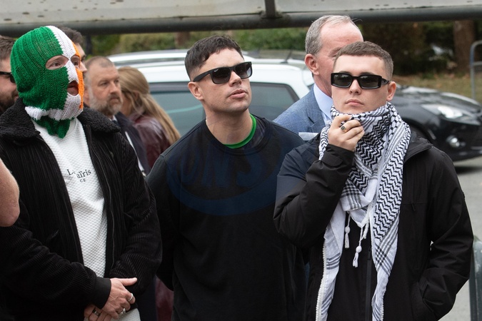 (L-R) - DJ Próvai ( J. J. Ó Dochartaigh), Móglaí Bap (Naoise Ó Cairealláin), and Mo Chara (Liam Óg Ó hAnnaidh) of Northern Irish trio Kneecap depart Woolwich Crown Court in London, England, UK on Friday 26 September, 2025 after judges dismissed a Terrorism charge against Mo Chara (Liam Óg Ó hAnnaidh)., Credit:Justin Ng / Avalon