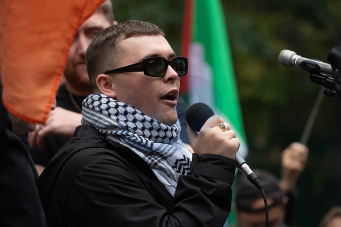 (Mo Chara (Liam Óg Ó hAnnaidh) of Northern Irish trio Kneecap speaks to the crowd at Woolwich Crown Court in London, England, UK on Friday 26 September, 2025 after judges dismissed a Terrorism charge against him., Credit:Justin Ng / Avalon