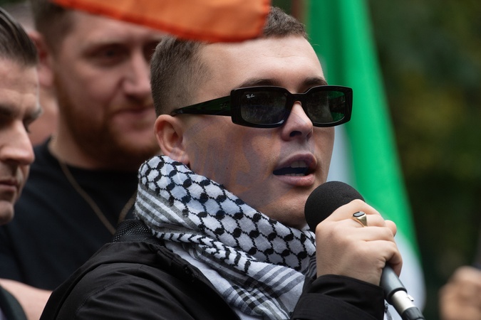 (Mo Chara (Liam Óg Ó hAnnaidh) of Northern Irish trio Kneecap speaks to the crowd at Woolwich Crown Court in London, England, UK on Friday 26 September, 2025 after judges dismissed a Terrorism charge against him., Credit:Justin Ng / Avalon